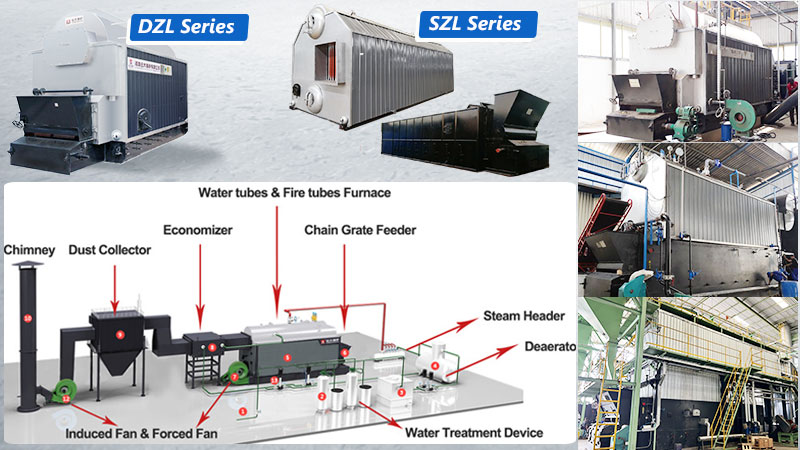 DZL coal boiler meaning single drum chain grate boiler, horizontal three pass design, water tube & fire tube structure.
